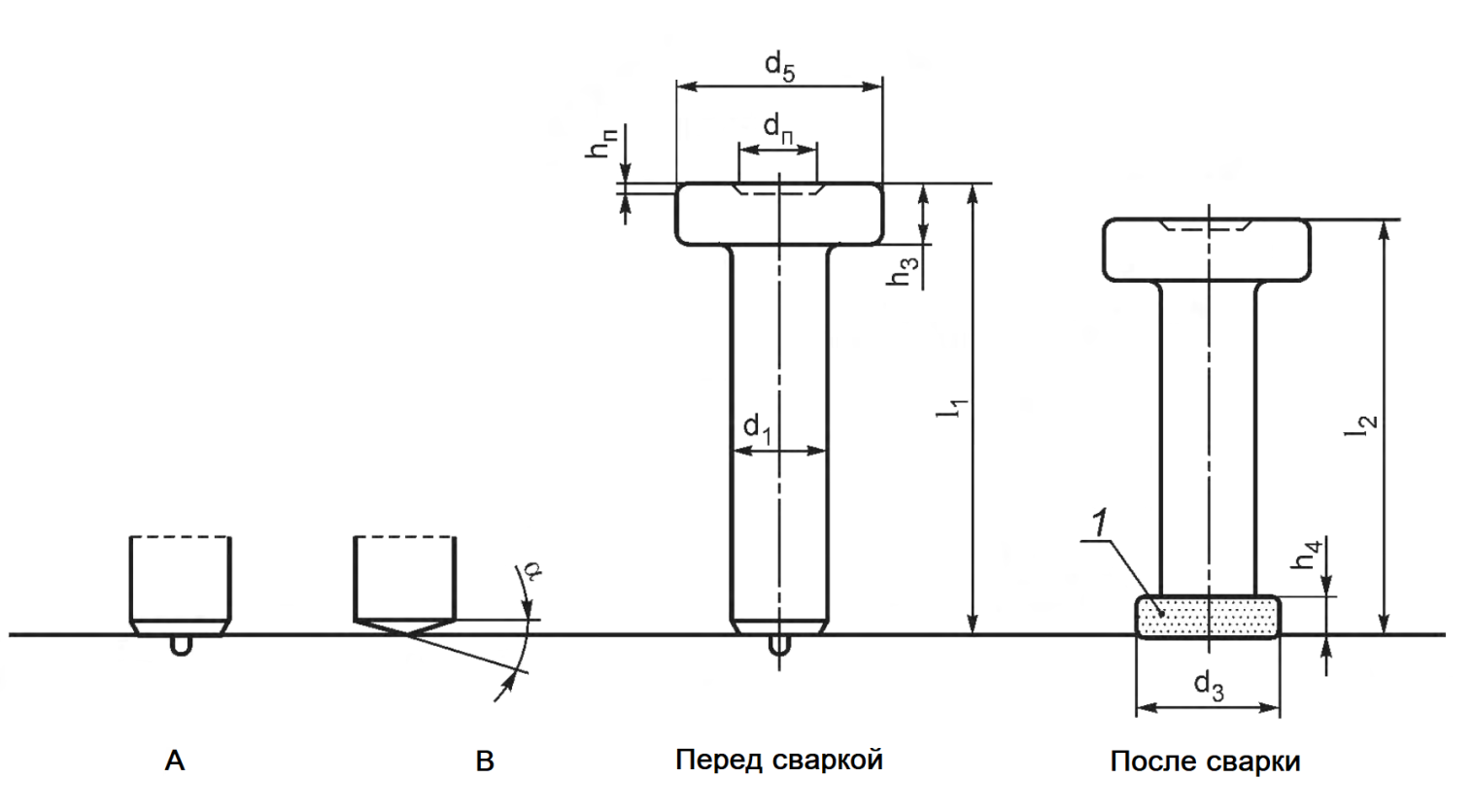 e) Длина шпильки перед сваркой определяется по формуле с учетом высоты переплавляемой части шпильки.